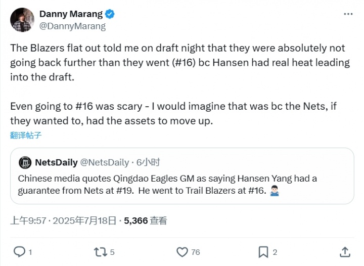 开拓者队记Danny Marang回应了篮网媒体的言论:“开拓者在选秀之夜明确告诉过我,他们绝对不会选择比现在的16顺位更低的顺位(来选杨瀚森),因为杨瀚森在选秀之前已经很有热度。即使是16顺位选也已经很危险,我想那是因为如果篮网愿意的话,他们是可以送出资产来提升选秀顺位截胡。”