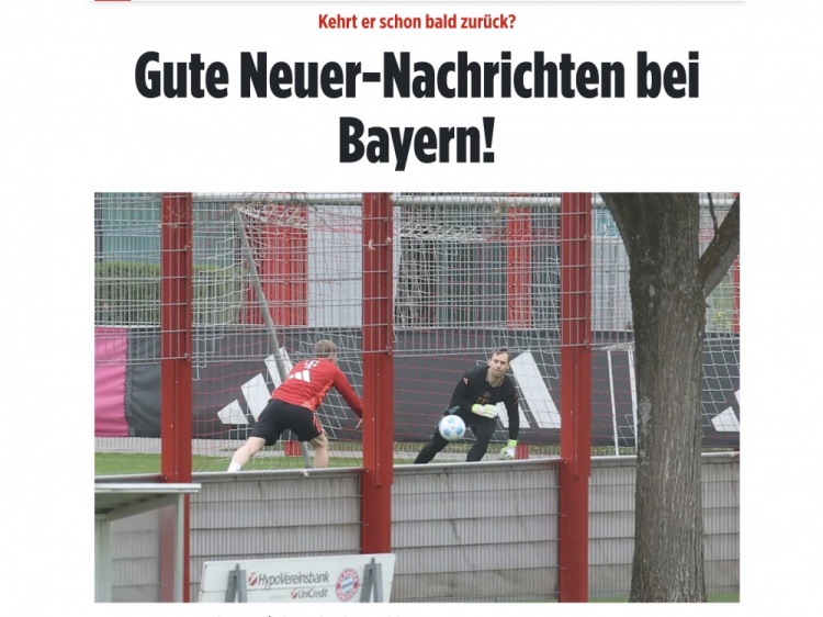 4月21日讯 据德媒《图片报》的报道称,拜仁门将诺伊尔在周一完成了一次个人训练,他已经能够进行飞扑的动作,有可能本周末就复出。