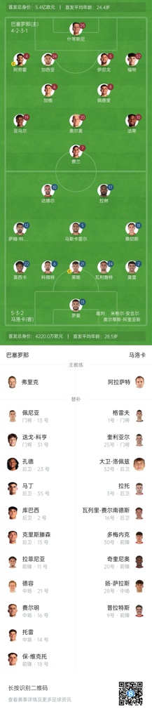 巴萨首发:25-什琴斯尼、4-阿劳霍、5-伊尼戈-马丁内斯、24-埃里克-加西亚、32-赫克托-福特、6-加维、8-佩德里、20-奥尔莫、7-费兰-托雷斯、19-亚马尔、10-法蒂
