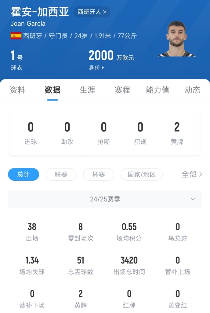24岁的霍安-加西亚本赛季代表西班牙人出战38场比赛,丢掉51球,完成8次零封。