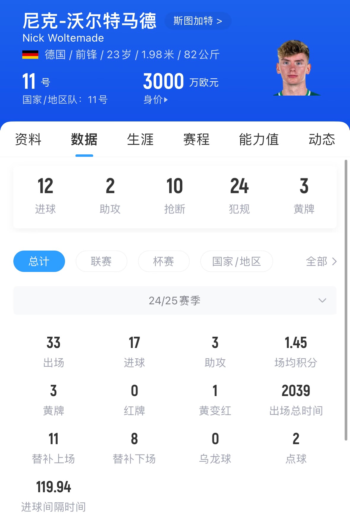 23岁的沃尔特马德当前合同至2028年6月,球员24-25赛季33场17球3助攻,德转身价3000万欧。