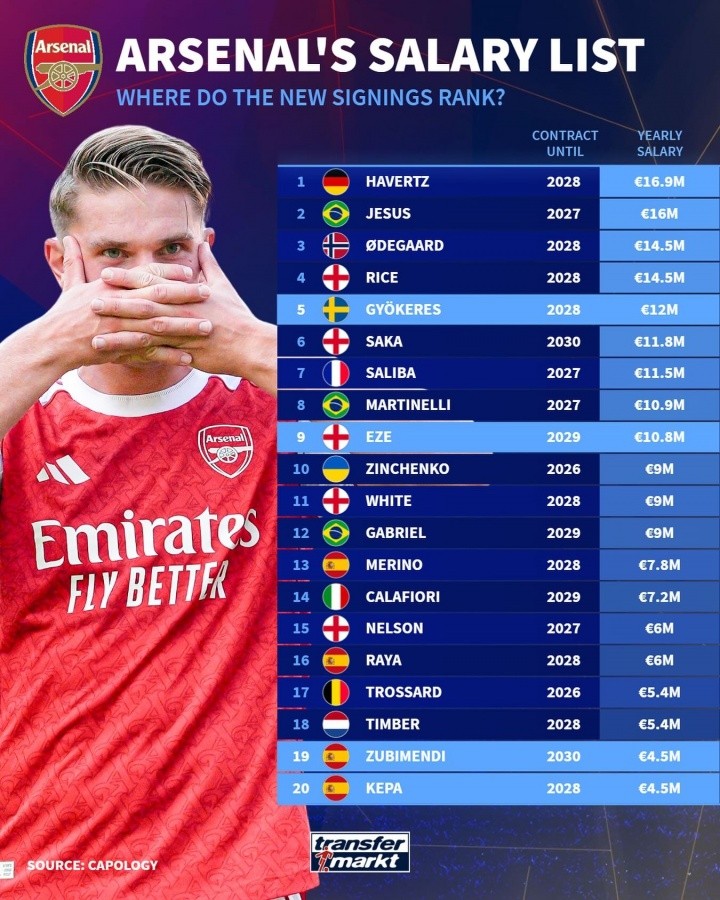 09月01日讯 德转列出了阿森纳球员的年薪排行,哈弗茨以1690万欧居首,今夏引进的约克雷斯和埃泽进入了球队前十。