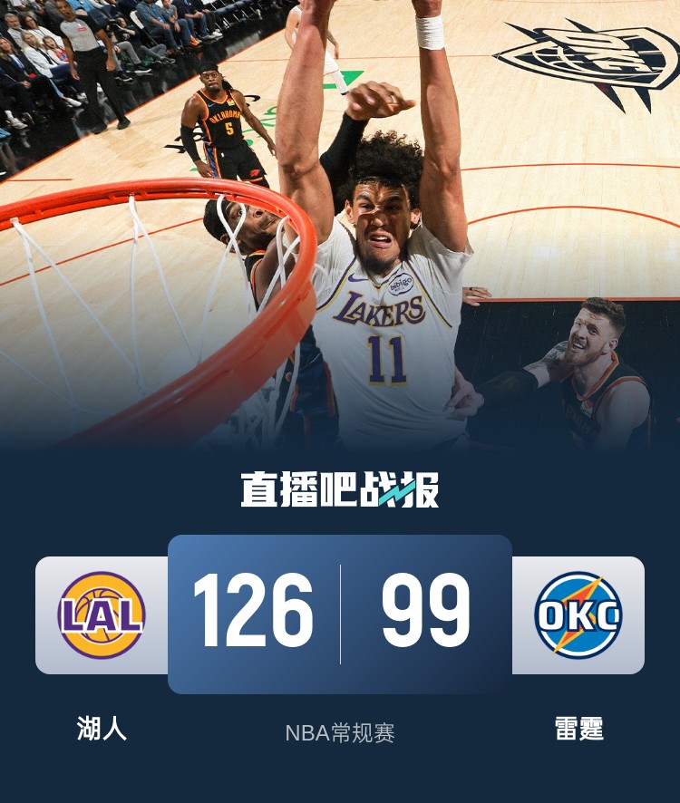 比赛开始,双方开场短暂相持,湖人外线开火,东契奇和文森特连续命中三分将分差拉开到两位数,次节湖人依旧火力凶猛,外线神准一举将优势扩大到20分以上,亚历山大得分助攻一肩挑苦苦支撑,半场战罢湖人78-56领先雷霆。易边再战,双方围绕20分的分差展开争夺,湖人多点开花保持优势,末节詹姆斯高效输出,湖人稳扎稳打没有给对手反扑的机会,最终,湖人126-99大胜雷霆,客场过关。