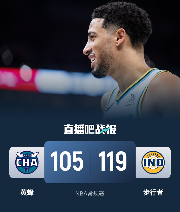 刚开场黄蜂进攻打得不错还能跟步行者咬住比分,随后步行者外线连续投进三分建立起领先。第二节上来步行者延续状态将分差拉大到两位数,不过黄蜂靠着布里奇斯的发挥掀起反扑缩小分差,这节两队命中率都有所下降,步行者经过拉锯后半场依旧保持8分优势。易边再战,步行者重拾手感上来又是一波攻势扩大领先,黄蜂没有放弃多次掀起反扑一度追到只差3分,哈利伯顿站出来带领步行者稳住局面并再次将分差拉大到两位数,此后黄蜂未能再追上比分,最终步行者119-105击败黄蜂取得2连胜。