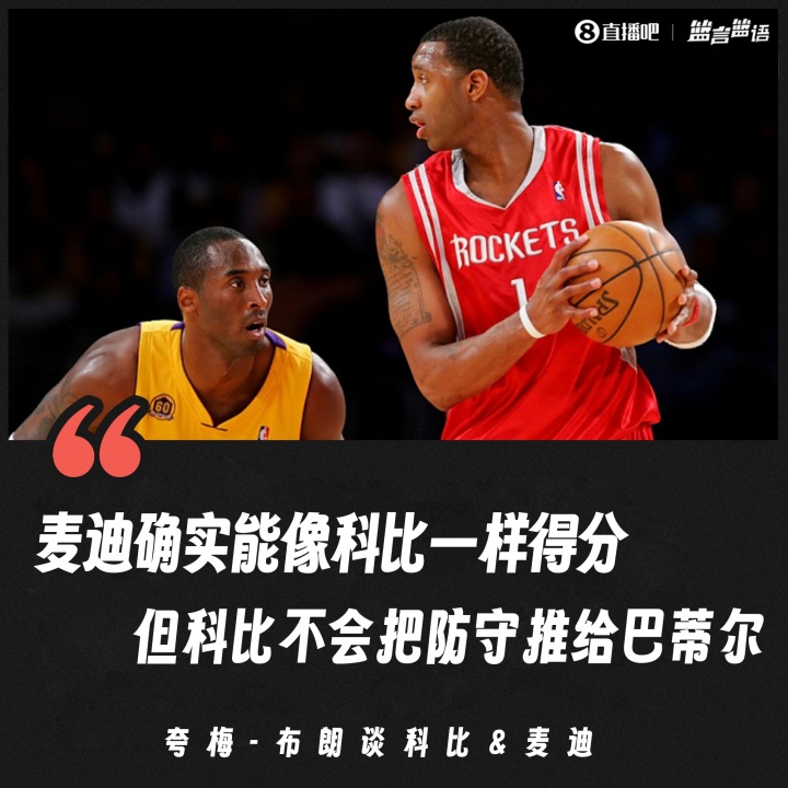 “麦迪从来都不如科比。麦迪确实能像科比一样得分,所以单看得分数据,他确实显得很厉害。但真正让科比胜过特雷西-麦克格雷迪、而且永远能胜过他的关键,在于科比骨子里的防守实力和防守意识。这就是为什么你会觉得科比能压制住他。当初人们一拿他和麦迪做各种比较,科比主动和他对位。真正的领头者、真正的狠角色,就愿意和强者正面交锋,就想感受对方身上的那种气场。你能看得出来,只要他们一在球场上对位,我们就能清楚看到谁更胜一筹。”