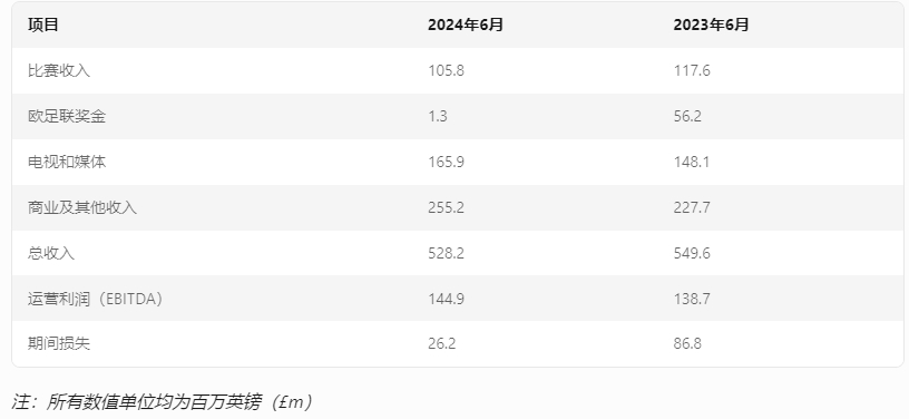 -比赛日收入1.058亿英镑(2023年:1.176亿英镑),主要由于本年度主场比赛场次比去年减少9场